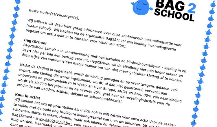 Kondig de inzamelingsactie duidelijk aan bij alle ouders nog voordat je de flyers uitdeelt aan de kinderen. De beste manier is via een brief die door de kinderen mee naar huis genomen moet worden of via een online nieuwsbrief die verstuurd wordt naar alle ouders. Wees hierin specifiek over waar je het geld voor gaat gebruiken, zodat ouders gemotiveerder zijn om meer kleding in te zamelen. Herinner ze er vooral aan hoe goed de vorige inzameling is verlopen en hoeveel er toen is opgehaald, of verwijs ze naar onze website waar ze kunnen zien hoeveel andere scholen al hebben meegedaan. Wij hebben alvast een voorbeeldbrief uitgewerkt die je kunt aanpassen met jullie persoonlijke informatie. Download de brief.